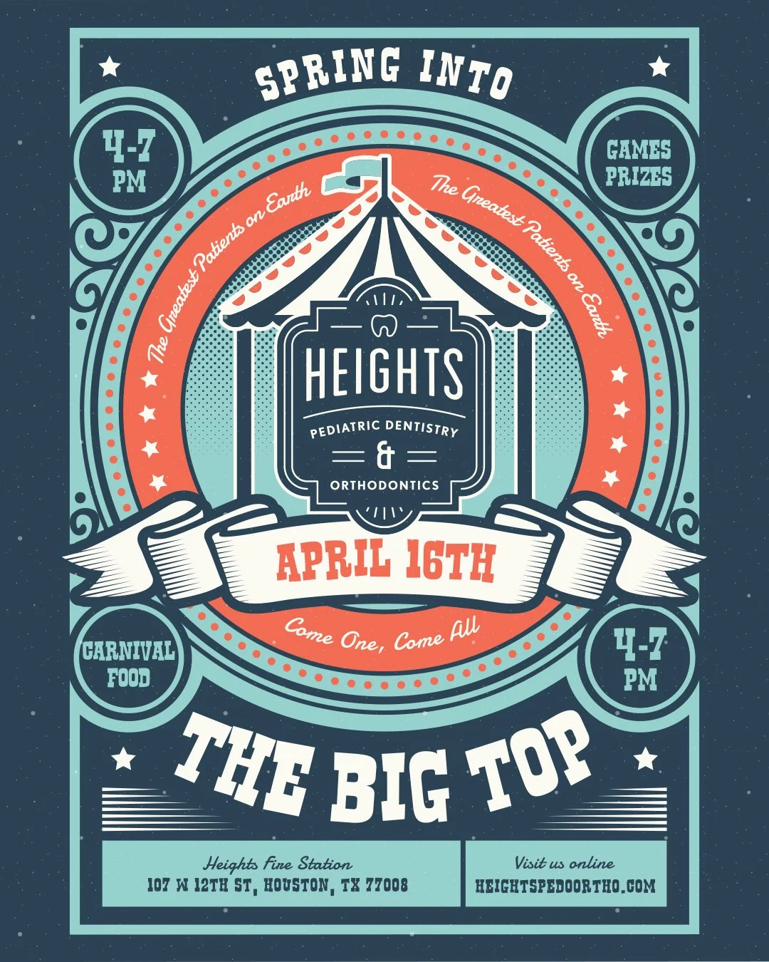 Step right up and join us for an evening under The Big Top at Heights Pediatric Dentistry & Orthodontics. We’re celebrating our amazing patients with carnival games, prizes, tasty treats, and plentyof fun for the whole family.